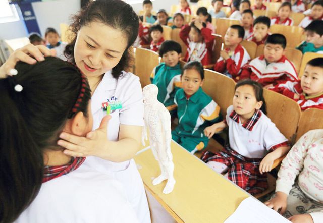 近日,山东省淄博市淄川区医院走进当地小学开展中医知识进课堂活动。课上,该院中医师用简洁的语言和直观的演示为学生们介绍了有关针灸、拔罐和经络穴位的知识,受到学生们的欢迎。